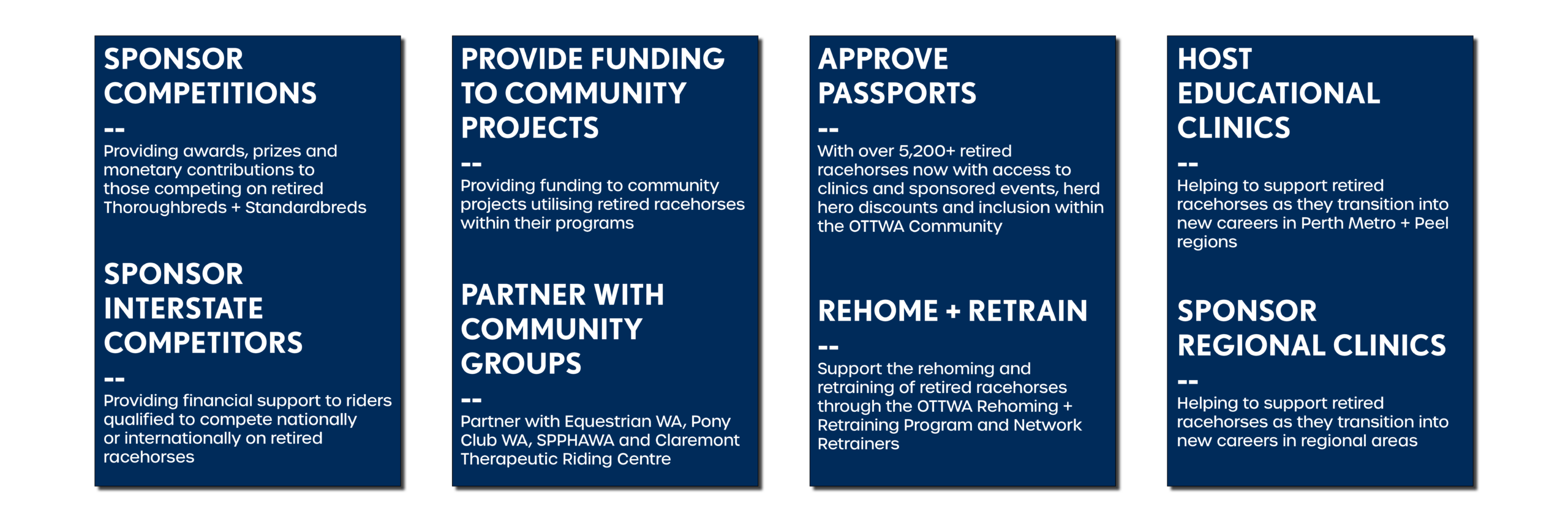 Off the Track WA supports and promotes retired thoroughbreds and standardbreds in their second careers as companion, pleasure or performance horses.