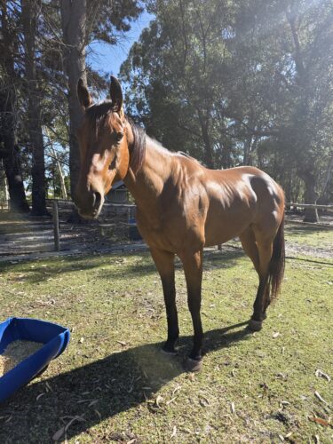 Kind compact gelding. Good to float, shoe and ride. Has been to the beach plenty of times ridden bareback. Can be strong/forward being straight off the track but most of the time is a nice ride.