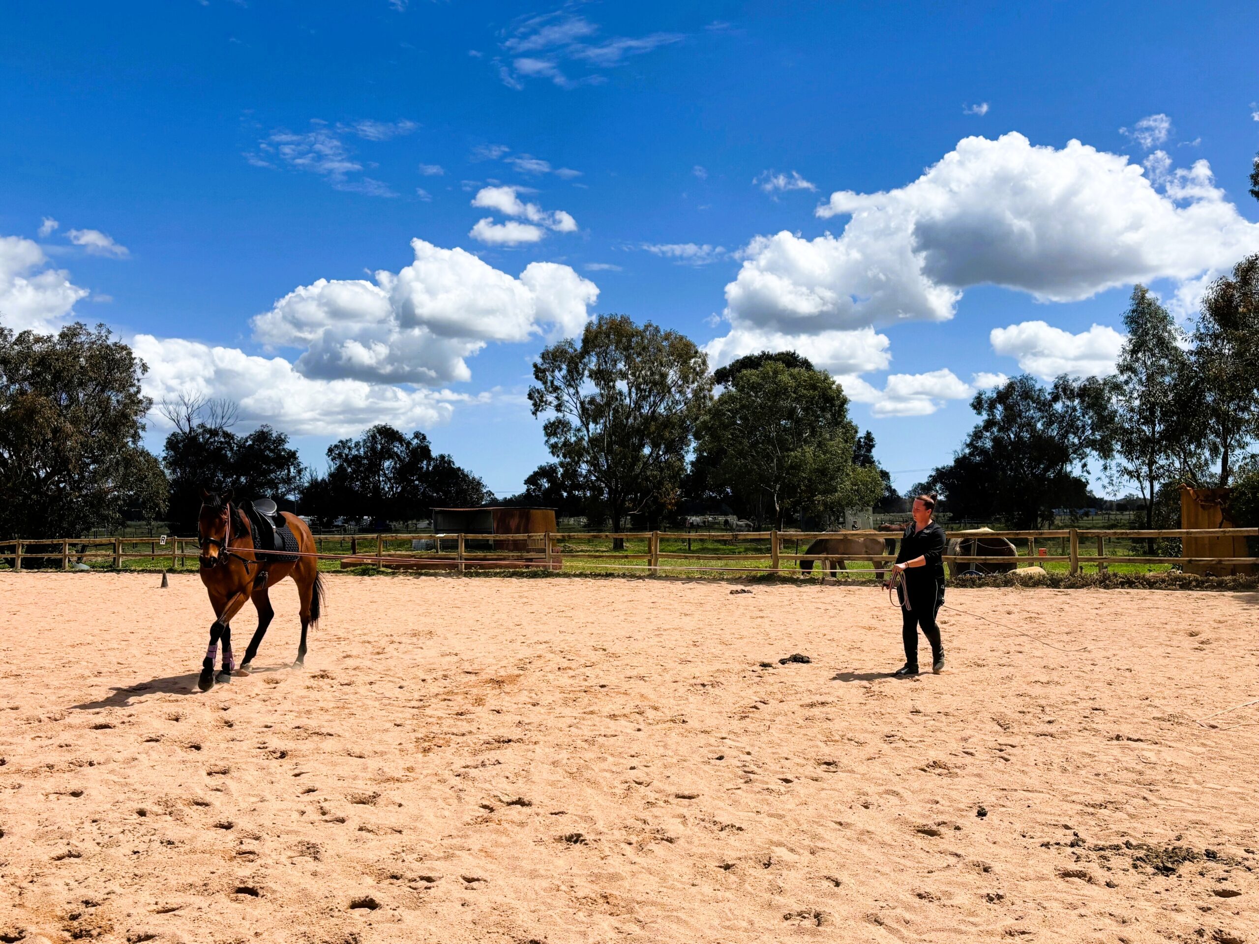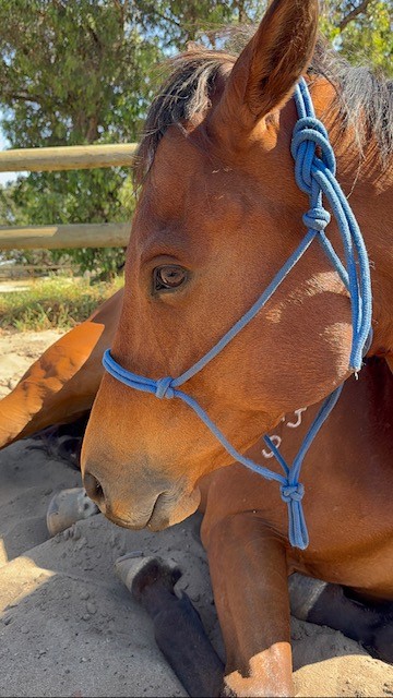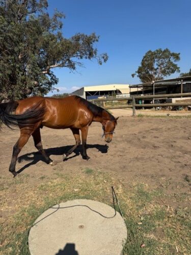 Buddy retired from racing in September 2024 and enjoyed a spell before undergoing re-education under saddle with his previous owner. He came to me in July 2025, and since then, we have returned to the fundamentals, focusing on groundwork, lunging, and correct reintroduction to work. He has been brilliant with the body worker, farrier and vet. He can get a little nervous in new environments, but once he settles down, he takes everything in stride. He has been exposed to farm animals, tractors, trucks, four-wheelers, dogs, and more.
