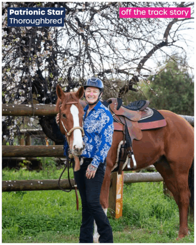 Purchased straight from Sparkes, Patrionic Star entered into the loving home of Karen Hardy. When asked what drew Karen to purchase an off the track horse, she responded: